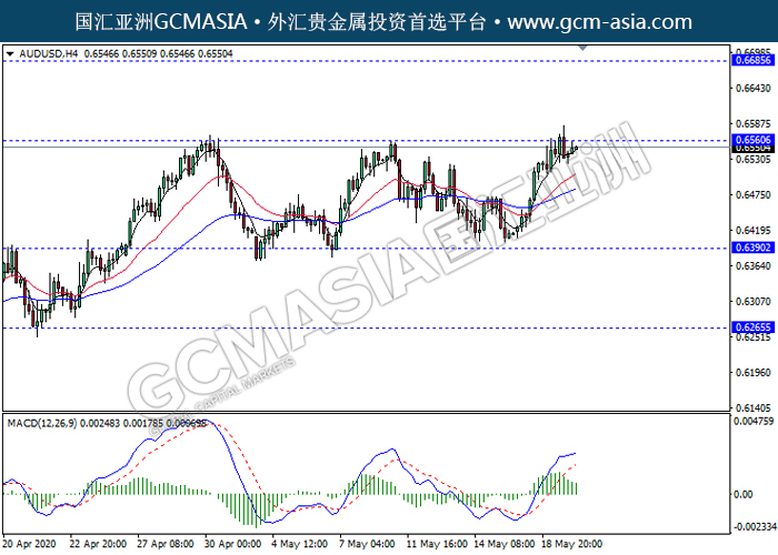 AUDUSD,H4:澳美多头排列,目前测试前期压力。然而,MACD显示空头信号,多头动能有所略减,短期关注空头回调为主。上方关注0.6560压力和0.6685压力,下方关注0.6390支撑和0.6265支撑。
