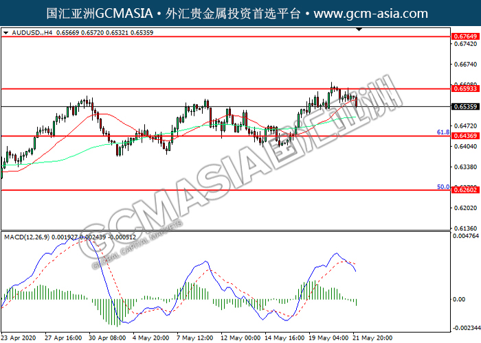 20200522 AUDUSD-午间 by keyk | May 22, 2020 | 澳元兑美元 | 0 comments GCMAsia - AUDUSD AUDUSD 2020-05-22 AUDUSD,H4:澳美震荡下行。MACD空头动能略增,短期关注空头为主。上方关注0.6595压力和0.6765压力,下方关注0.6435支撑和0.6260支撑。