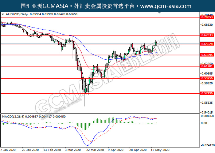 20200522 AUDUSD by willy | May 21, 2020 | 澳元兑美元 | 0 comments GCMAsia - AUDUSD AUDUSD 2020-05-22 AUDUSD,Daily:澳美突破后持续上行。MACD显示多头信号,短期可关注多头走势为主。上方关注0.6705压力和0.7005压力,下方关注0.6555支撑和0.6370支撑。