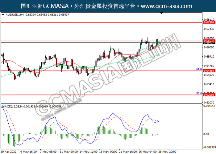 AUDUSD,H4:澳美震荡上行,目前测试前期压力。MACD空头动能有所略减,若突破可关注多头为主。上方关注0.6655压力和0.6790压力,下方关注0.6435支撑和0.6260支撑。