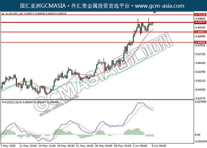 AUDUSD,H4:澳美震荡上行,目前测试前期压力。然而,MACD空头动能略增,短期可关注技术性回调为主。上方关注0.6955压力和0.7010压力,下方关注0.6880支撑和0.6800支撑。