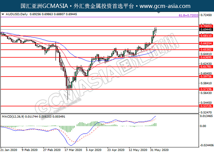 AUDUSD,Daily:澳美突破后持续上行。MACD显示多头信号,中期可持续关注多头走势为主。上方关注0.7005压力和0.7205压力,下方关注0.6810支撑和0.6655支撑。