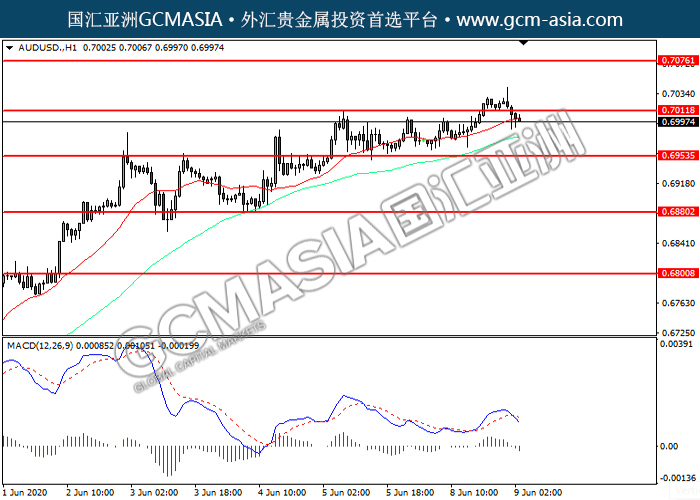 20200609 AUDUSD-午间 by keyk | Jun 9, 2020 | 澳元兑美元 | 0 comments GCMAsia - AUDUSD AUDUSD 2020-06-09 AUDUSD,H1:澳美震荡下行。MACD形成死叉,动能转弱,短期可关注持续空头为主。上方关注0.7010压力和0.7075压力,下方关注0.6955支撑和0.6880支撑。