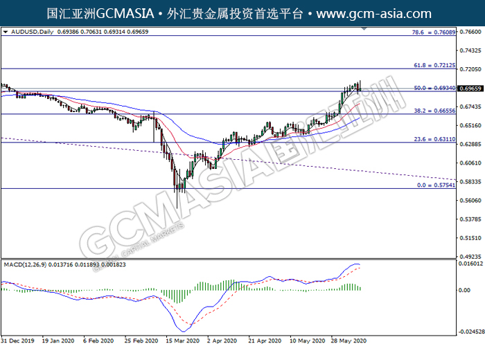 AUDUSD,Daily:澳美高位承压后回落。MACD显示空头信号,中期可持续关注空头走势为主。上方关注0.7215压力和0.7610压力,下方关注0.6935支撑和0.6655支撑。