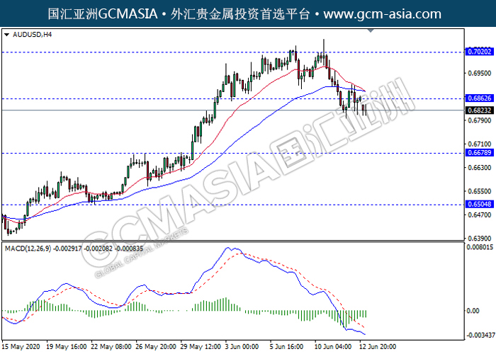 20200615 AUDUSD-午间 by keyk | Jun 15, 2020 | 澳元兑美元 | 0 comments GCMAsia - AUDUSD AUDUSD 2020-06-15 AUDUSD,H4:澳美高位回落。MACD动能持续略减,短期可关注空头为主。上方关注0.6860压力和0.7020压力,下方关注0.6680支撑和0.6505支撑。