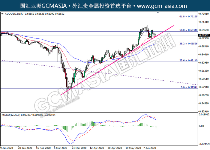 AUDUSD,Daily:澳美高位承压后回落,目前测试着上升趋势线。MACD动能持续略减,若突破可关注空头为主。上方关注0.6935压力和0.7215压力,下方关注0.6655支撑和0.6310支撑。