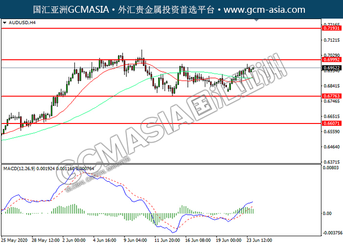 AUDUSD,H4:澳美震荡上行,目前靠近前期压力。然而,MACD多头动能略减,短期可关注技术性回调为主。上方关注0.7000压力和0.7195压力,下方关注0.6775支撑和0.6605支撑。