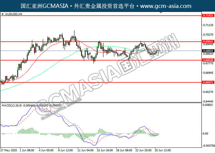 20200626 AUDUSD-午间 by keyk | Jun 26, 2020 | 澳元兑美元 | 0 comments GCMAsia - AUDUSD AUDUSD 2020-06-26 AUDUSD,H4:澳美震荡下行。然而,MACD空头动能略减,短期关注多头反弹趋势为主。上方关注0.6965压力和0.7195压力,下方关注0.6805支撑和0.6605支撑。