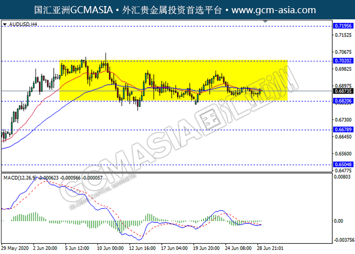 AUDUSD,H4:澳美区间交易,目前测试前期支撑。然而,开始形成金叉,动能略增,短期关注多头趋势为主。上方关注0.7020压力和0.7195压力,下方关注0.6820支撑和0.6680支撑。