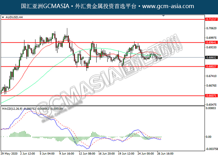 20200629 AUDUSD by willy | Jun 29, 2020 | 澳元兑美元 | 0 comments GCMAsia-AUDUSD AUDUSD 2020-06-29 AUDUSD,H4:澳美震荡下行。然而,MACD空头动能略减,短期可关注技术性回调为主。上方关注0.6965压力和0.7120压力,下方关注0.6805支撑和0.6605支撑。