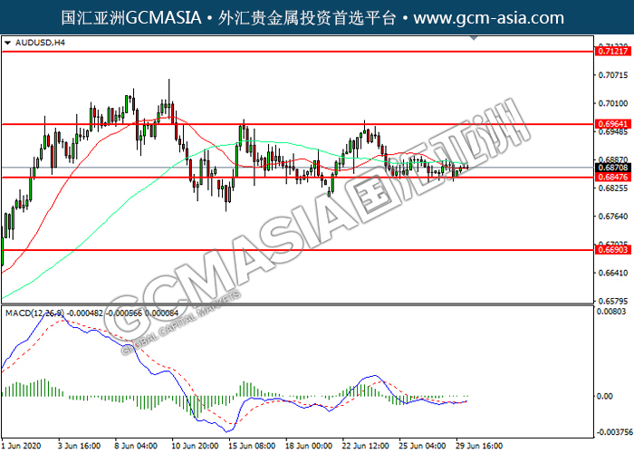 20200630 AUDUSD by willy | Jun 30, 2020 | 澳元兑美元 | 0 comments GCMAsia-AUDUSD AUDUSD 2020-06-30 AUDUSD,H4:澳美震荡盘整。MACD空头动能略减,短期可关注多头为主。上方关注0.6965压力和0.7120压力,下方关注0.6845支撑和0.6690支撑。