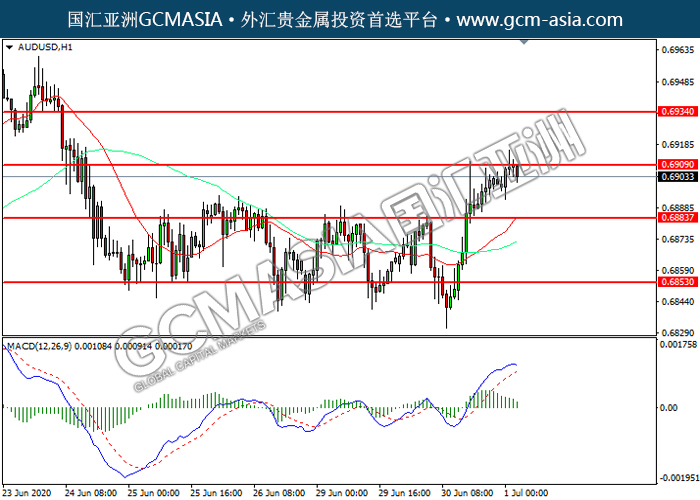 AUDUSD,H1:澳美高位承压回落。MACD多头动能略减,短期可持续关注空头为主。上方关注0.6910压力和0.6935压力,下方关注0.6885支撑和0.6855支撑。