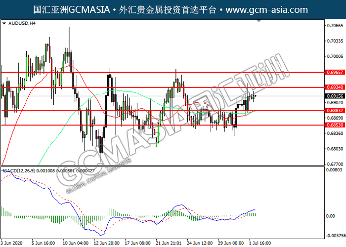 20200702 AUDUSD-午间 by willy | Jul 2, 2020 | 澳元兑美元 | 0 comments GCMAsia - AUDUSD AUDUSD 2020-07-02 AUDUSD,H4:澳美震荡上行。然而,MACD多头动能略减,短期可关注技术性回调为主。上方关注0.6935压力和0.6965压力,下方关注0.6885支撑和0.6855支撑。