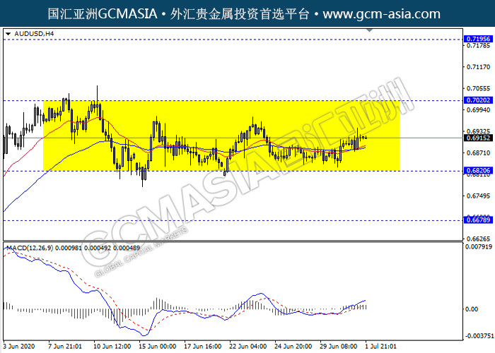AUDUSD,H4:澳美仍区间震荡,近期低位反弹。然而,MACD动能略增,短期关注多头趋势为主。上方关注0.7020压力和0.7195压力,下方关注0.6820支撑和0.6680支撑。
