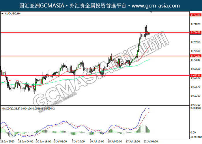AUDUSD,H4:澳美多头排列,目前测试前期压力。然而,MACD多头动能略减,短期关注技术性空头回调为主。上方关注0.7145压力和0.7235压力,下方关注0.7025支撑和0.6925支撑。