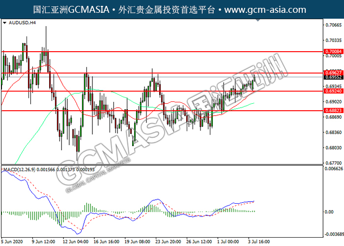 AUDUSD,H4:澳美震荡上行,目前测试前期压力。然而,MACD多头动能略减,短期可关注技术性回调为主。上方关注0.6965压力和0.7010压力,下方关注0.6925支撑和0.6880支撑。