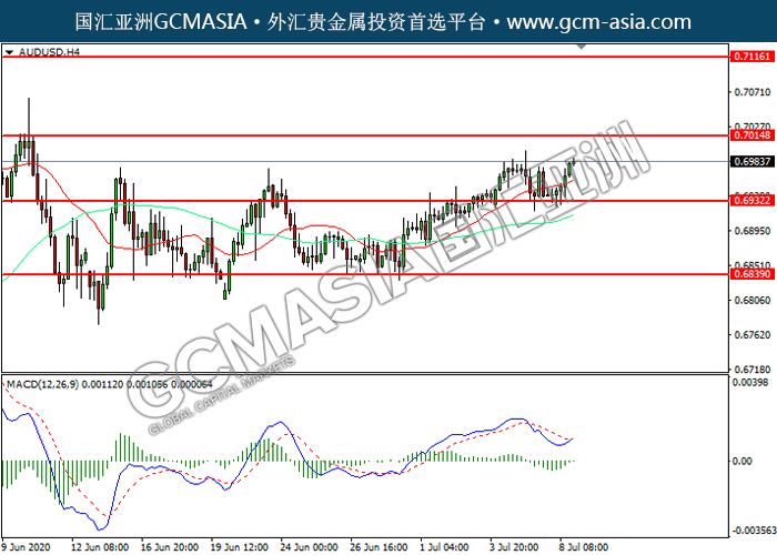 20200709 AUDUSD by willy | Jul 9, 2020 | 澳元兑美元 | 0 comments GCMAsia-AUDUSD AUDUSD 2020-07-09 AUDUSD,H4:澳美震荡上行。MACD空头动能略减,短期可关注多头为主。上方关注0.7015压力和0.7115压力,下方关注0.6930支撑和0.6840支撑。
