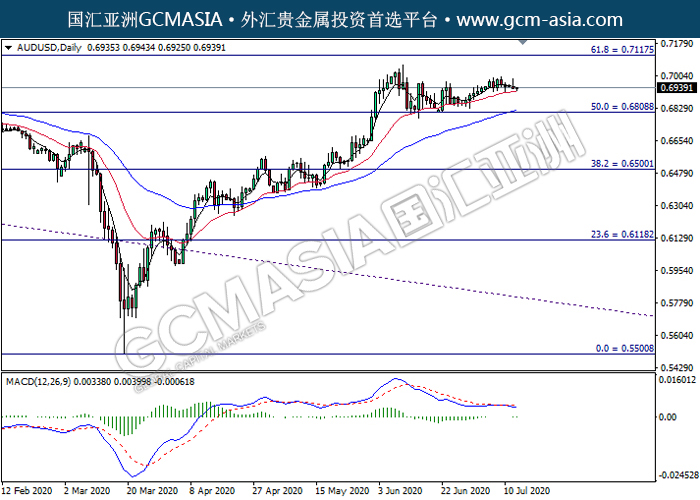 AUDUSD,Daily:澳美高位承压后回落。MACD显示空头信号,动能略减,中期可关注空头为主。上方关注0.7115压力和0.7295压力,下方关注0.6810支撑和0.6500支撑。