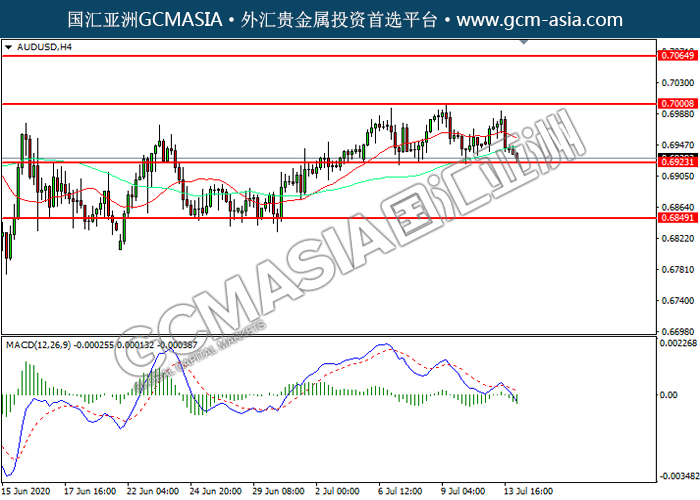 AUDUSD,H4:澳美震荡下行,目前测试前期支撑。MACD空头动能略增,若下破可关注空头为主。上方关注0.7000压力和0.7065压力,下方关注0.6925支撑和0.6850支撑。