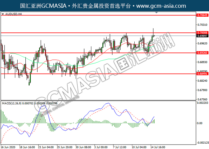 AUDUSD,H4:澳美震荡上行,目前测试前期压力。MACD多头动能略增,若突破可关注多头为主。上方关注0.7000压力和0.7065压力,下方关注0.6925支撑和0.6850支撑。
