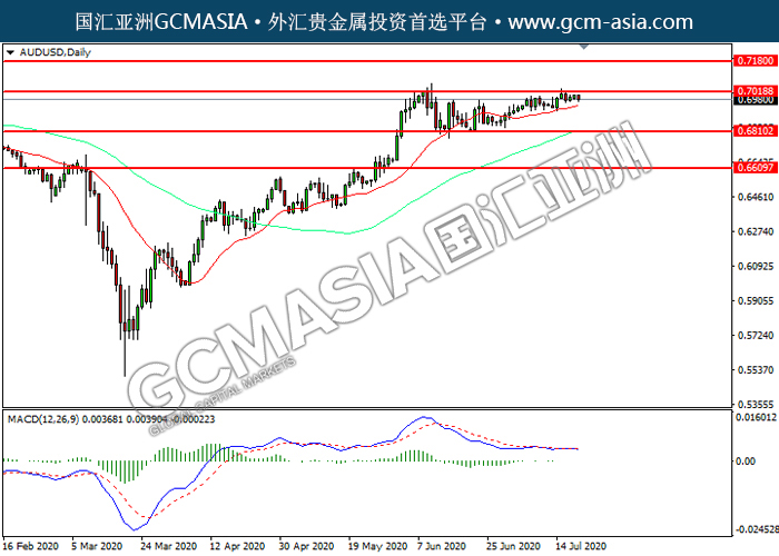 AUDUSD,Daily:澳美震荡盘整,目前测试前期压力。MACD已形成死叉,动能转弱,短期可关注空头回调为主。上方关注0.7020压力和0.7180压力,下方关注0.6810支撑和0.6610支撑。