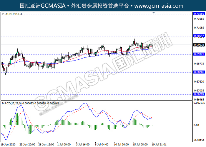 AUDUSD,H4:澳美触及MACD线后低位反弹。MACD开始形成金叉,动能略增,短期继续关注多头趋势为主。上方关注0.7055压力和0.7195压力,下方关注0.6935支撑和0.6820支撑。