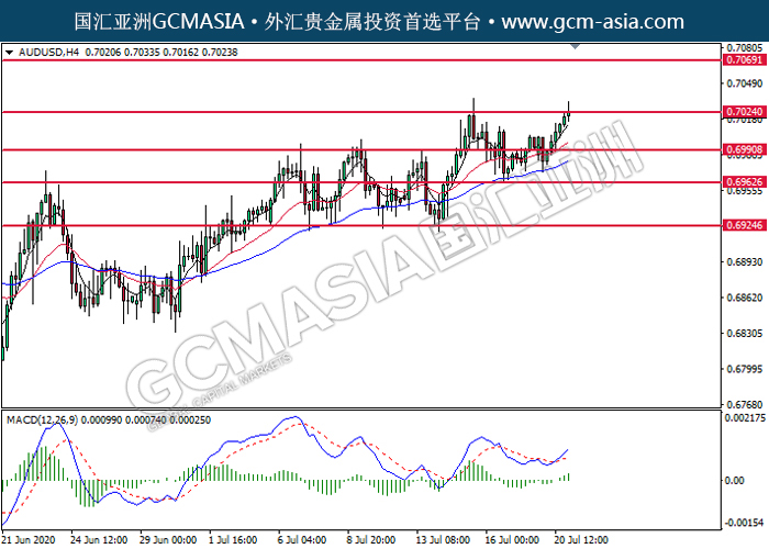 20200721 AUDUSD-Noon by willy | Jul 21, 2020 | 澳元兑美元 | 0 comments GCMAsia-AUDUSD AUDUSD 2020-07-21 AUDUSD,H4:澳美突破后持续上行。MACD显示多头信号,动能略增,若突破可关注多头为主。上方关注0.7025压力和0.7070压力,下方关注0.6990支撑和0.6965支撑。