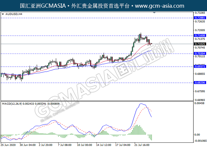 AUDUSD,H4:澳美高位承压回落。然而,MACD形成死叉,动能略减,短期继续看空回调为主。上方关注0.7160压力和0.7290压力,下方关注0.7030支撑和0.6935支撑。