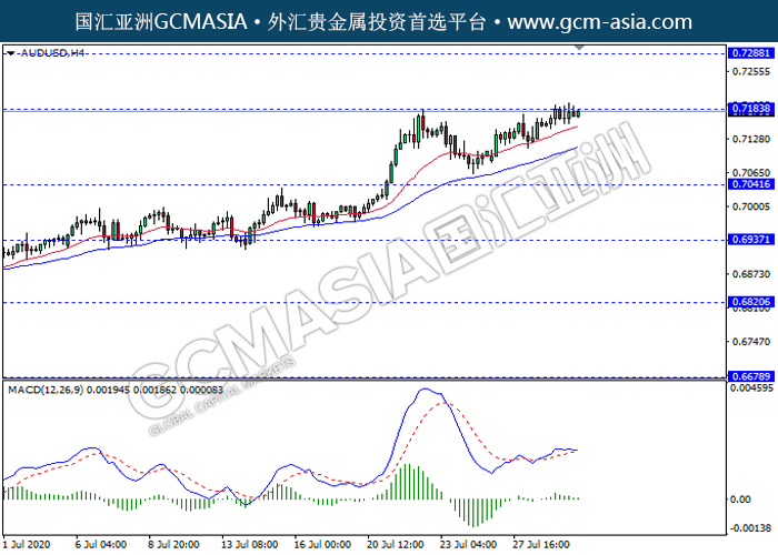 AUDUSD,H4:澳美震荡上行,目前测试前期压力。MACD多头动能有所略减,短期关注技术性空头回调为主。上方关注0.7185压力和0.7290压力,下方关注0.7040支撑和0.6935支撑。