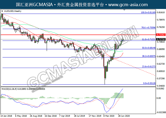 AUDUSD,Weekly:澳美突破前期压力,震荡上行。然而,MACD多头动能略减,短期可关注技术性回调为主。上方关注0.7335压力和0.7560压力,下方关注0.7120支撑和0.6815支撑。