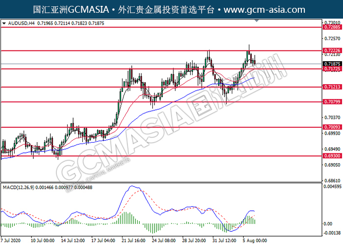 20200806 AUDUSD-午间 by keyk | Aug 6, 2020 | 澳元兑美元 | 0 comments GCMAsia - AUDUSD AUDUSD 2020-08-06 AUDUSD,H4:澳美高位承压后回落。MACD显示多头动能略减,短期可持续关注空头为主。上方关注0.7225压力和0.7290压力,下方关注0.7175支撑和0.7120支撑。