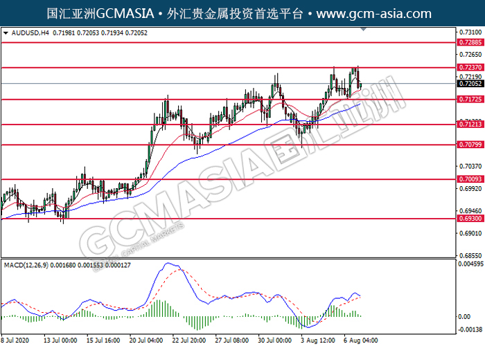 20200807 AUDUSD-午间 by keyk | Aug 7, 2020 | 澳元兑美元 | 0 comments GCMAsia - AUDUSD AUDUSD 2020-08-07 AUDUSD,H4:澳美高位承压后回落。MACD显示多头动能略减,短期可持续关注空头为主。上方关注0.7235压力和0.7290压力,下方关注0.7175支撑和0.7120支撑。
