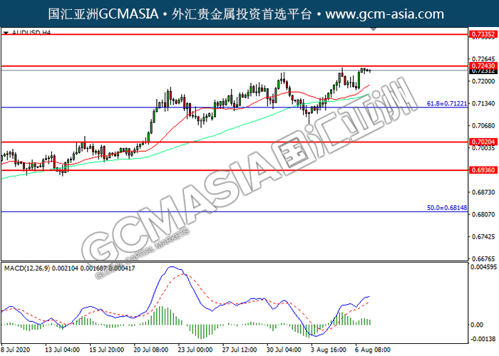 AUDUSD,H4:澳美震荡上行,目前测试前期压力。然而,MACD多头动能略减,短期可关注技术性回调。上方关注0.7245压力和0.7335压力,下方关注0.7120支撑和0.7020支撑。