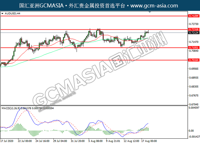 AUDUSD,H4:澳美震荡上行,目前测试前期压力。然而,MACD多头动能略减,短期可关注技术性回调。上方关注0.7230压力和0.7330压力,下方关注0.7105支撑和0.7015支撑。