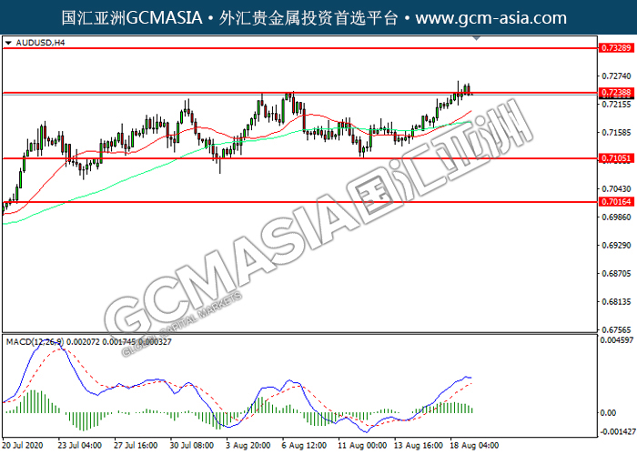 AUDUSD,H4:澳美震荡上行,目前测试前期压力。然而,MACD多头动能略减,短期可关注技术性回调。上方关注0.7230压力和0.7330压力,下方关注0.7105支撑和0.7015支撑。