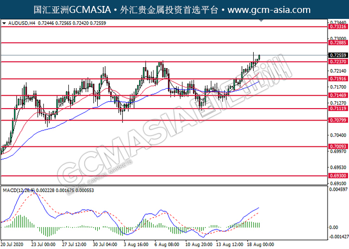 20200819 AUDUSD by willy | Aug 19, 2020 | 澳元兑美元 | 0 comments GCMAsia-AUDUSD AUDUSD 2020-08-19 AUDUSD,H4:澳美突破后持续上行。MACD显示多头信号,短期可关注多头走势。上方关注0.7290压力和0.7330压力,下方关注0.7235支撑和0.7190支撑。