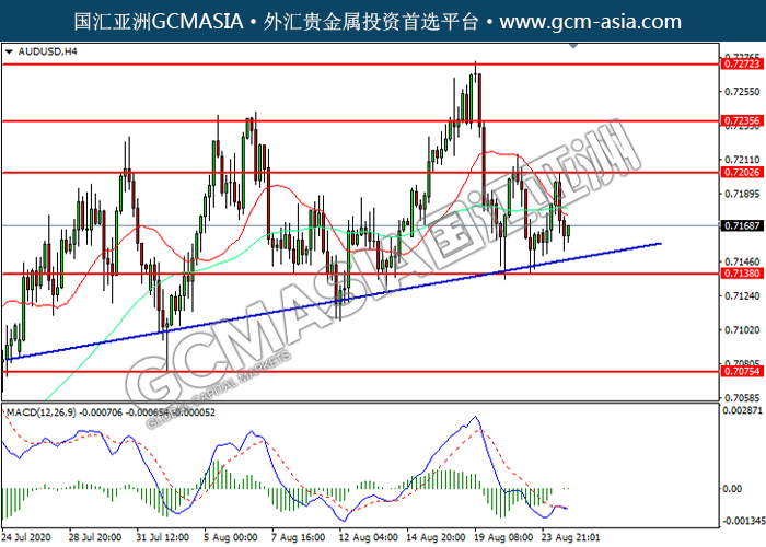 AUDUSD,H4:澳美高位回落。然而,MACD已形成金叉,动能转强,短期可关注技术性回调。上方关注0.7205压力和0.7235压力,下方关注0.7140支撑和0.7075支撑。