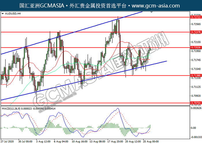 AUDUSD,H4:澳美震荡上行,目前测试前期压力。MACD多头动能略增,若突破可关注多头为主。上方关注0.7205压力和0.7235压力,下方关注0.7140支撑和0.7075支撑。