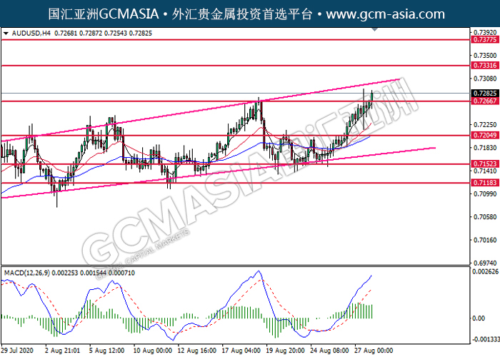 AUDUSD,H4:澳美突破后持续上行。MACD显示多头信号,动能转强,短期可关注多头走势为主。上方关注0.7330压力和0.7375压力,下方关注0.7265支撑和0.7205支撑。
