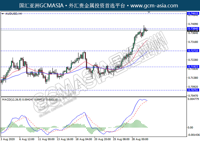 AUDUSD,H4:澳美多头排列,目前测试前期压力。然而,MACD多头动能有所略减,短期关注技术性空头回调为主。上方关注0.7385压力和0.7460压力,下方关注0.7275支撑和0.7190支撑。