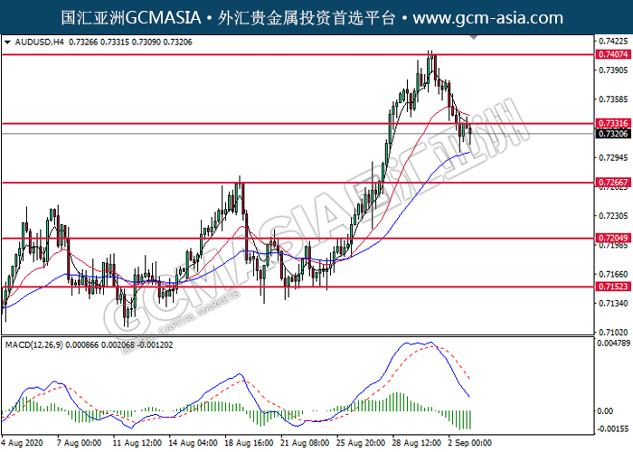 20200903 AUDUSD-午间 by willy | Sep 3, 2020 | 澳元兑美元 | 0 comments GCMAsia-AUDUSD AUDUSD 2020-09-03 AUDUSD,H4:澳美高位承压后回落。MACD显示空头动能偏强,短期可关注空头走势为主。上方关注0.7330压力和0.7405压力,下方关注0.7265支撑和0.7205支撑。
