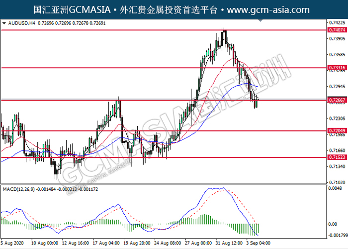 AUDUSD,H4:澳美低位反弹,目前测试着压力位。MACD显示空头动能转弱,短期可关注多头走势为主。上方关注0.7265压力和0.7330压力,下方关注0.7205支撑和0.7150支撑。