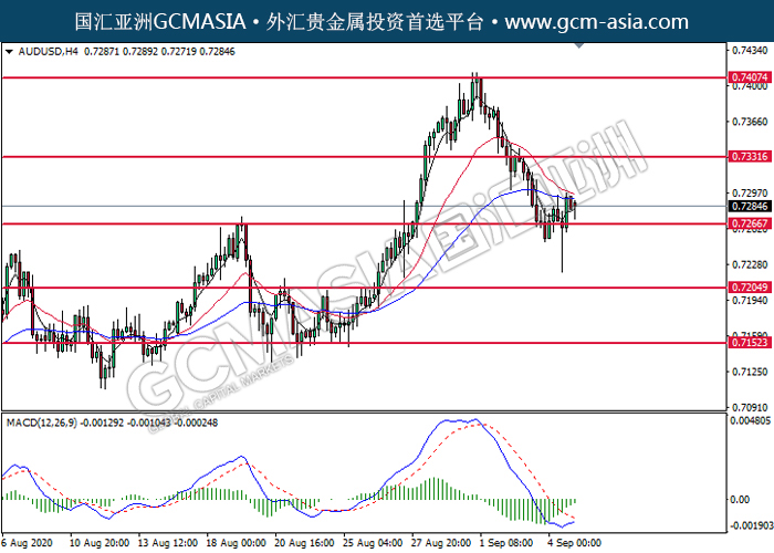 20200907 AUDUSD by willy | Sep 7, 2020 | 澳元兑美元 | 0 comments GCMAsia-AUDUSD AUDUSD 2020-09-07 AUDUSD,H4:澳美低位反弹。MACD显示空头动能转弱,短期可关注多头走势为主。上方关注0.7330压力和0.7405压力,下方关注0.7265支撑和0.7205支撑。