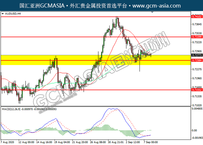 AUDUSD,H4:澳美震荡下行,目前靠近前期支撑。然而,MACD多头动能略增,短期关注技术性反弹趋势为主。上方关注0.7340压力和0.7410压力,下方关注0.7260支撑和0.7155支撑。
