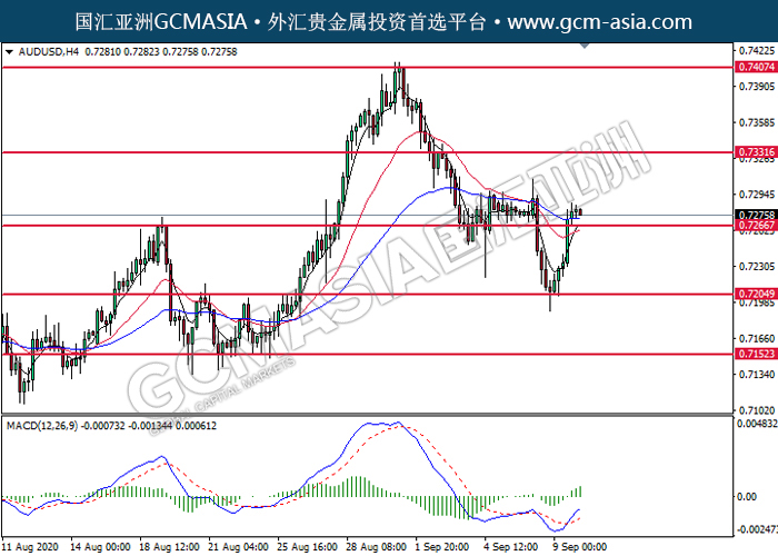20200910 AUDUSD by willy | Sep 10, 2020 | 澳元兑美元 | 0 comments GCMAsia-AUDUSD AUDUSD 2020-09-10 AUDUSD,H4:澳美突破后持续上行。MACD显示多头动能转强,短期可关注多头走势为主。上方关注0.7330压力和0.7405压力,下方关注0.7265支撑和0.7205支撑。