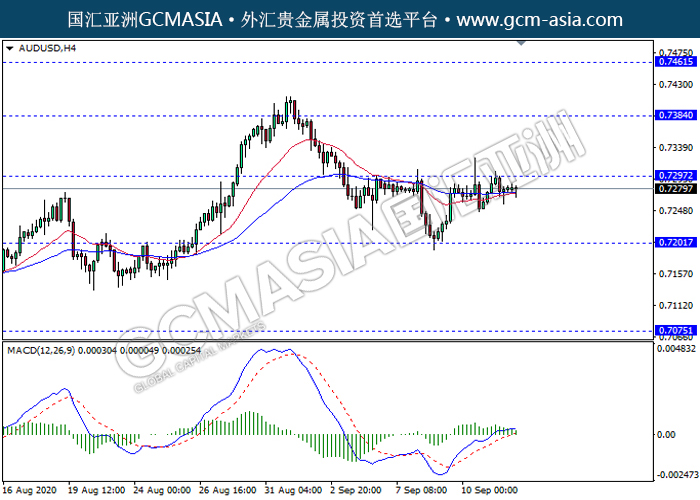 AUDUSD,H4:澳美震荡盘整,同时测试靠近前期压力。然而,MACD多头动能有所略减,短期关注空头方向为主。上方关注0.7295压力和0.7385压力,下方关注0.7200支撑和0.7075支撑。