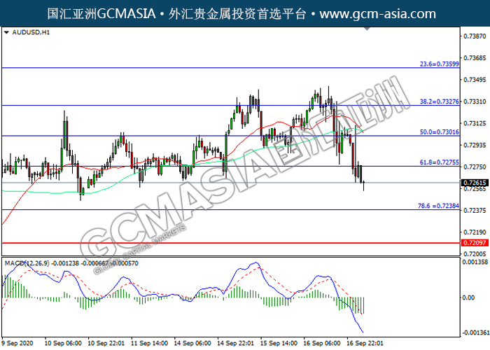 AUDUSD,H1:澳美突破前期支撑,震荡下行。MACD空头动能有所略增,短期可持续关注空头为主。上方关注0.7275压力和0.7300压力,下方关注0.7240支撑和0.7210支撑。