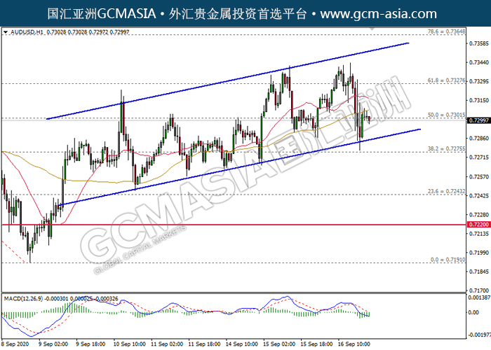 20200917 AUDUSD by willy | Sep 17, 2020 | 澳元兑美元 | 0 comments GCMAsia - AUDUSD AUDUSD 2020-09-17 AUDUSD,H1:澳美震荡下行。MACD依然显示空头信号,短期关注空头势力为主。上方关注0.7330压力和0.7365压力,下方关注0.7300支撑和0.7275支撑。