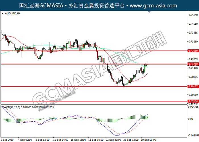 AUDUSD,H4:澳美震荡上行,目前测试前期压力。然而,MACD多头动能略减,短期可关注技术性回调为主。上方关注0.7170压力和0.7260压力,下方关注0.7015支撑和0.6910支撑。