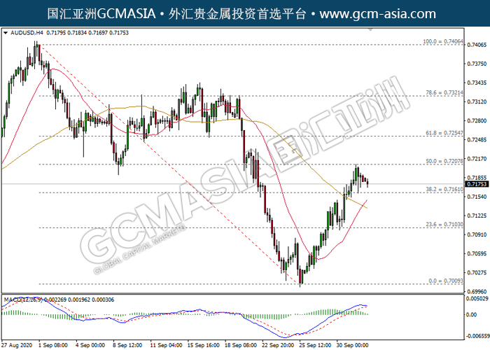 20201002 AUDUSD by willy | Oct 2, 2020 | 澳元兑美元 | 0 comments GCMAsia - AUDUSD AUDUSD 2020-10-02 AUDUSD,H4:澳美受承压回落。MACD多头动能有所略减,短期关注空头势力。上方关注0.7210压力和0.7255压力,下方关注0.7160支撑和0.7100支撑。